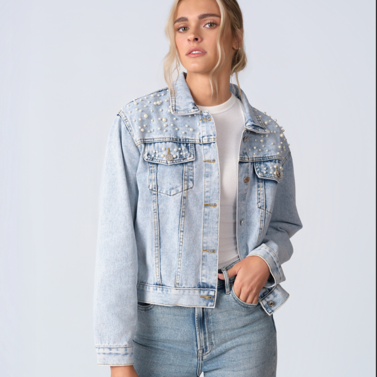 The pearls elevate this jacket into something unforgettable, blending softness with bold, custom artistry.